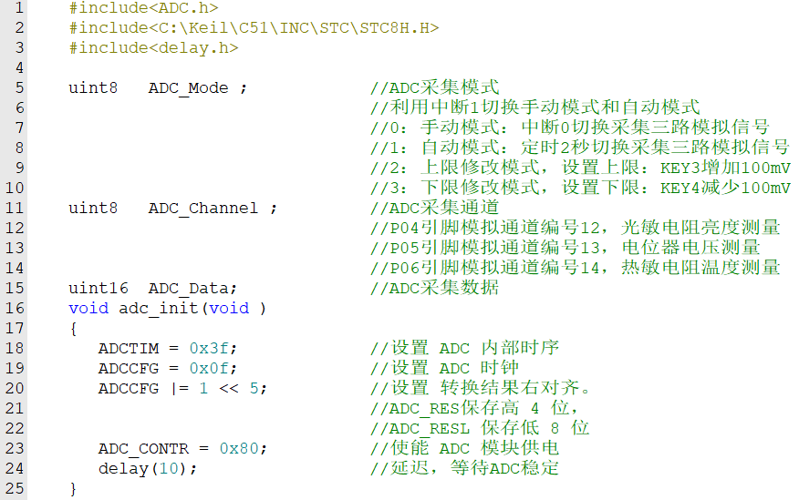 本实验用Proteus仿真的同学注意,Proteus里无STC8,只有STC15单片机。STC15单片机和STC8单片机的ADC内部结构有区别、引脚分布不一样,程序也有所不同,借鉴以下PPT中的程序。