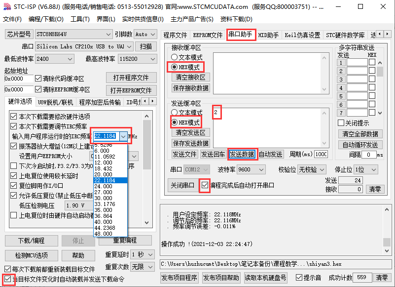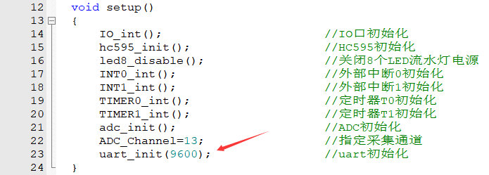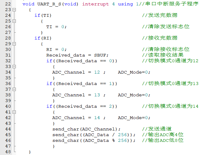 系统时钟f为22.1184MHz,串口波特率设为9600bps,无校验。上位机上使用串口调试助手向单片机发送一个数字X,如果单片机接收上位机发送的数据是0、1、2,则分别采集通道ADC12、ADC13、ADC14的模拟电压显示在右侧4个数码管上,并通过串口将AD通道和采集结果(先发高4位,再发低8位)发送给计算机。