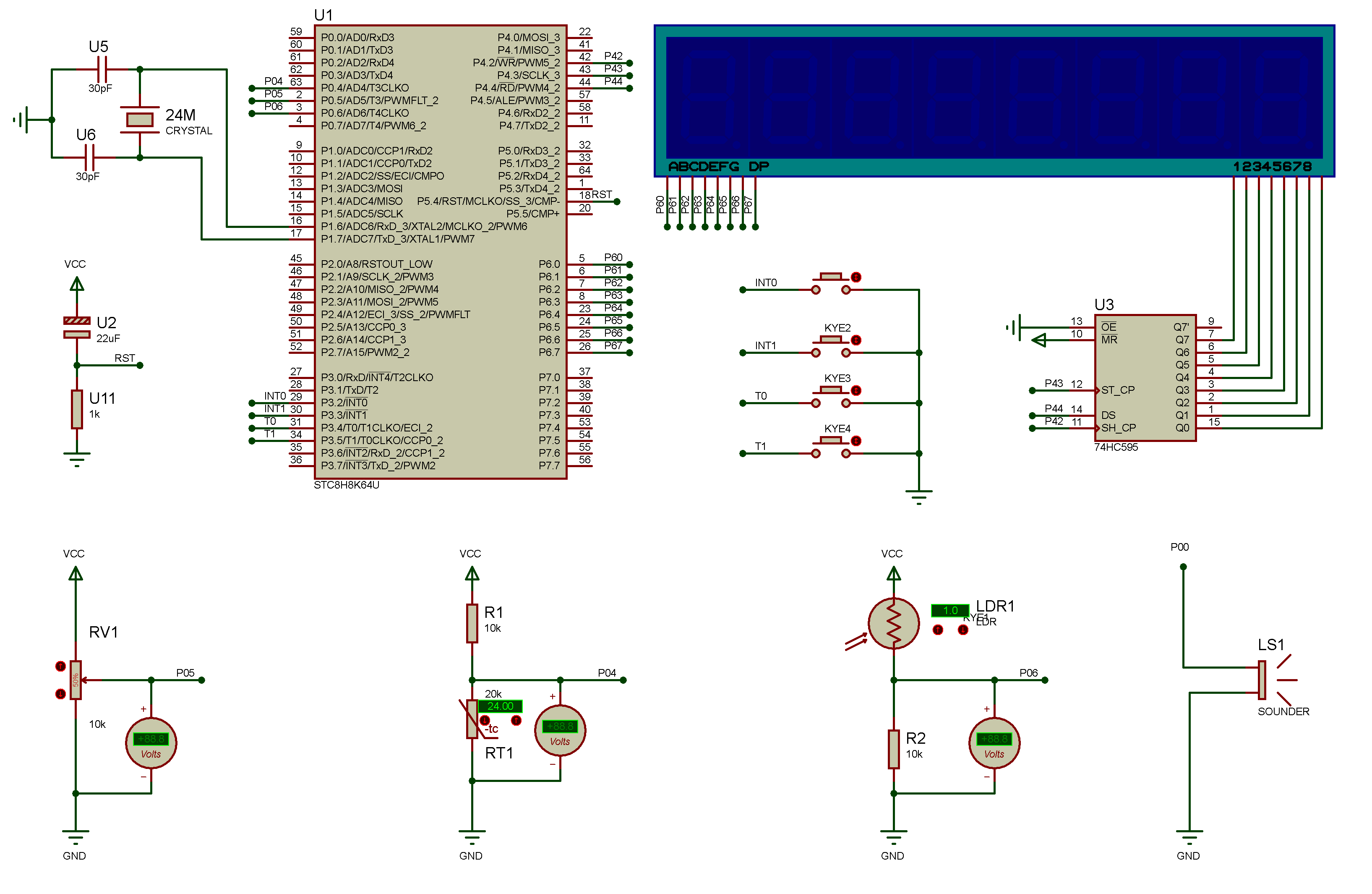 (4)自动模式:利用中断1切换手动模式和自动模式。在自动模式下,利用定时器定时2秒,每隔2秒自动切换轮流采集光敏电阻亮度测量、热敏电阻温度测量、电位器电压测量模拟信号;