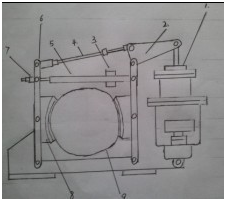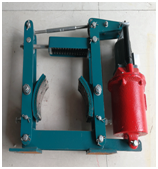 3、于是固定在左、右制动臂上的2块制动片(瓦块8),同时向内运动,握住制动轮9,实现制动。