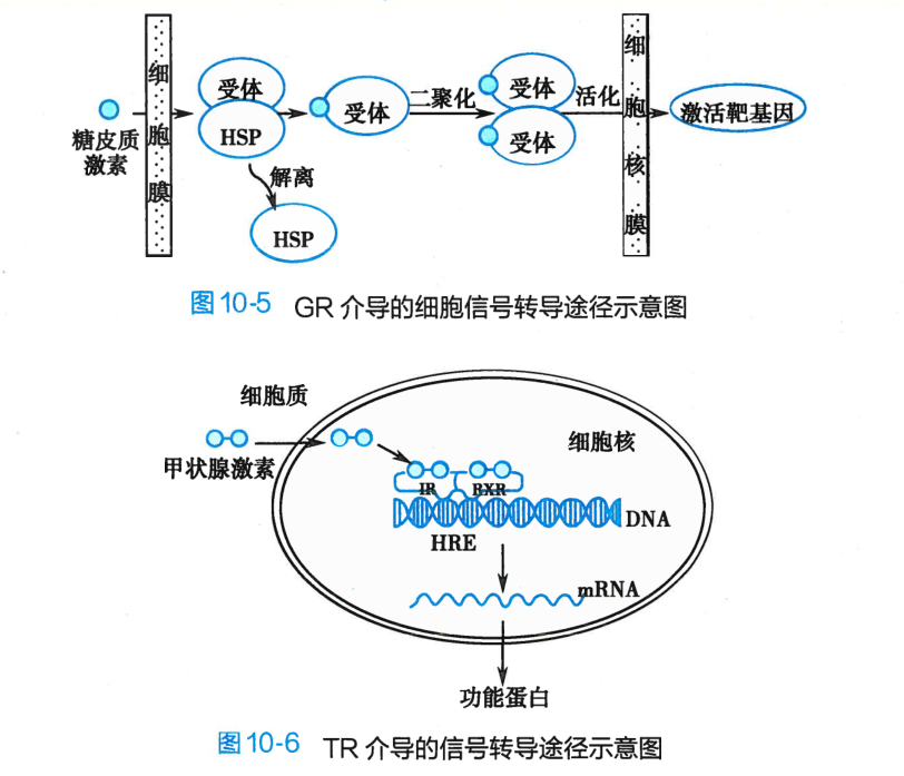 ①类固醇激素受体家族,包括糖皮质激素、盐皮质激素、性激素受体等。类固醇激素受体家族位于胞浆(除雌激素受体位于核内),未与配体结合前与热休克蛋白(heat shock protein,HSP)结合存在,处于非活化状态。配体与受体的结合使HSP与受体解离,暴露DNA结合区。激活的受体二聚化并转移入核,与DNA上的激素反应元件(hormone response element, HRE)相结合或与其他转录因子相互作用,增强或抑制靶基因转录(图10-5);