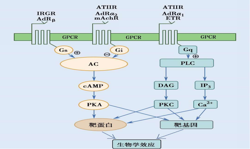 β肾上腺素受体、胰高血糖素受体等激活后与Gs偶联,活化的Gsα增加腺苷酸环化酶的活性,促进cAMP生成。而α2肾上腺素受体、M2胆碱受体及血管紧张素Ⅱ(angiotensin II,AngⅡ)受体等激活则与Gi偶联,抑制cAMP的生成。cAMP可激活蛋白激酶A(protein kinase A,PKA),引起多种靶蛋白磷酸化,调节其功能。