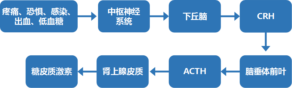 应激时,神经内分泌反应是代谢和多种器官功能变化的基础。其中,最重要的神经内分泌反应是激活蓝斑-交感-肾上腺髓质系统( locus ceruleus-sympathetic-adrenal medulla system,LSAM)和下丘脑-垂体-肾上腺皮质系统( hypothalamus- pituitary -adrenal cortex system, HPAC)。此外,还可出现其他多种神经内分泌的变化。