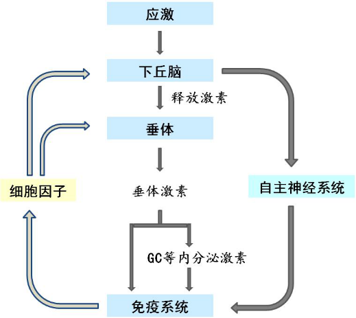 应激(如感染、急性损伤)可直接引发免疫反应,也可通过神经内分泌系统导致免疫功能的改变;