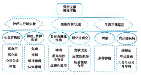 应激相关疾病(stress related diseases): 应激在其发生发展中是一个重要的原因或诱因,如原发性高血压、冠心病、溃疡性结肠炎、代谢性疾病、支气管哮喘、癌症、抑郁症等。