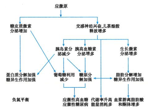 急性应激时,代谢率升高,糖、蛋白质和脂肪的分解代谢增强、合成代谢降低,可出现应激性高血糖、血中游离脂肪酸和酮体增多以及负氮平衡。