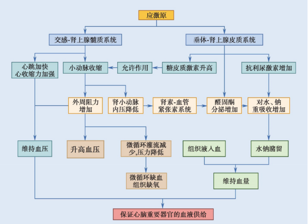 同时伴有ADH的释放和肾素-血管紧张素醛固酮(RAA)系统的激活,从而导致心率增快,心肌收缩力增强,心排血量增加,血容量增加,血压升高,以保证重要脏器的供血需要。
