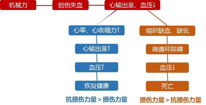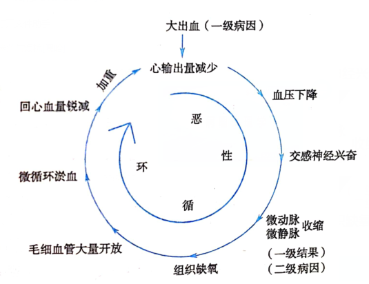 不同原因引起的失血性休克中组织血液灌流进行性下降的过程,是因果交替导致恶性循环而加重损伤的典型范例。