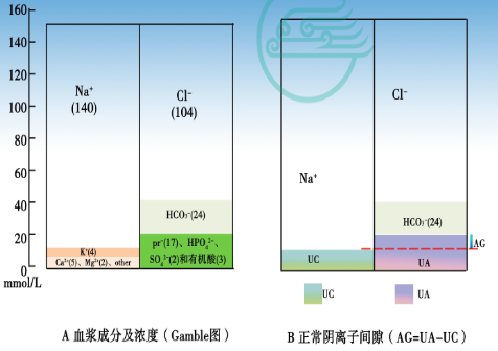 AG = UA-UC=Na+ - Cl- -HCO3- = 140-104-24 = 12 (mmol/L),波动范围(12±2)mmol/L