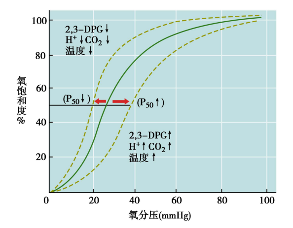 血液pH下降、温度升高、CO2分压升高或红细胞内2,3-DPG增多时,Hb与氧的亲和力降低,氧离曲线右移;