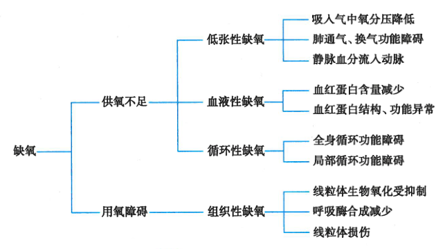 其中,因动脉血灌流不足引起的缺氧称为缺血性缺氧(ischemic hypoxia),因静脉血回流障碍引起的缺氧称为淤血性缺氧(congestive hypoxia)。
