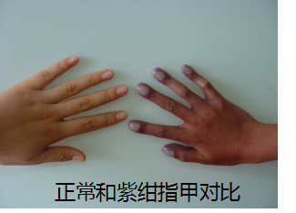 当毛细血管血液中脱氧血红蛋白浓度达到或超过5g/dl时,皮肤和黏膜呈青紫色,称为发绀(cyanosis)。