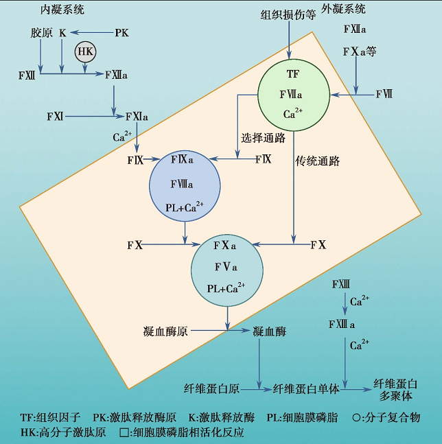 外源性凝血系统的激活是从组织因子( tissue factor, TF)释放开始的。血液中的FⅦ含有Ca2+结合氨基酸,组织因子释放后,形成TF-Ca2+-Ⅶ复合物,FⅦ被激活为FⅦa。TF-Ⅶa可激活FⅩ,FⅩa与Va、PL-Ca2+形成凝血酶原激活物,凝血酶原被激活为凝血酶,凝血酶使纤维蛋白原转变为纤维蛋白单体,纤维蛋白单体相互聚合,最终形成不溶于水的交联纤维蛋白多聚体;凝血酶还可使血小板活化,从而启动凝血过程。此外,TF-Ⅶa除激活FⅩ以外,还可激活FⅨ,FⅨa与Ⅶa、PL-Ca2+形成Ⅹ因子激活物,产生更多的凝血酶,呈现放大效应。