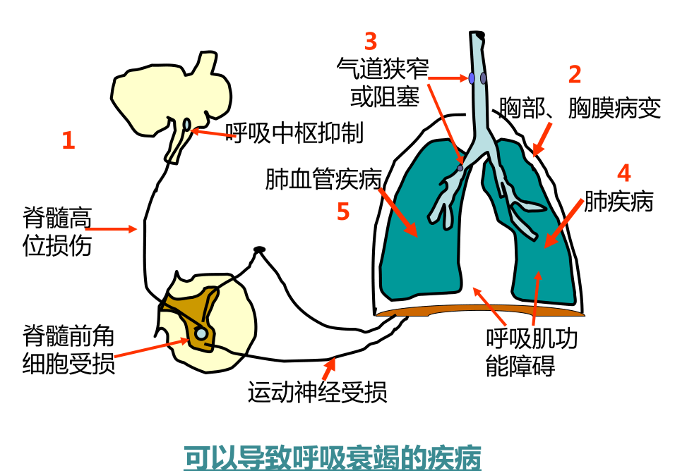 呼吸衰竭的原因和发病机制:肺通气功能障碍、肺换气功能障碍(弥散障碍、肺泡通气与血流比例以及解剖分流增加)