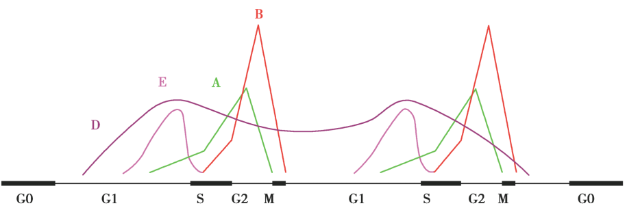 不同cyclin表现出各自独特的表达及降解特性,使得eyclin蛋白随着细胞周期的改变而发生含量和种类的变化(见图11-2),有助于每个有丝分裂事件在时间上的协调性。