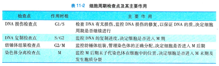 根据细胞周期检查点的调控内容,将其分为DNA损伤检查点、DNA复制检查点、纺锤体组装检查点和染色体分离检查点(表11-2),各检查点所处位置和功能各异。