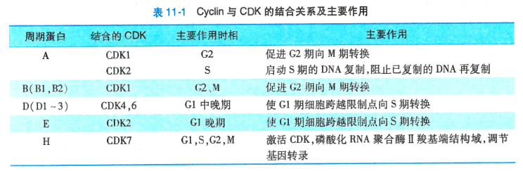 在细胞周期的不同时相,会有不同的cyclin/CDK异二聚体形成,其调控着细胞周期某一时相顺利进行,也推动着这一时相向下一时相的转变(表11-1)。