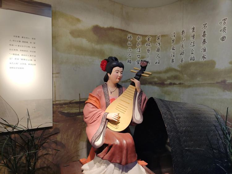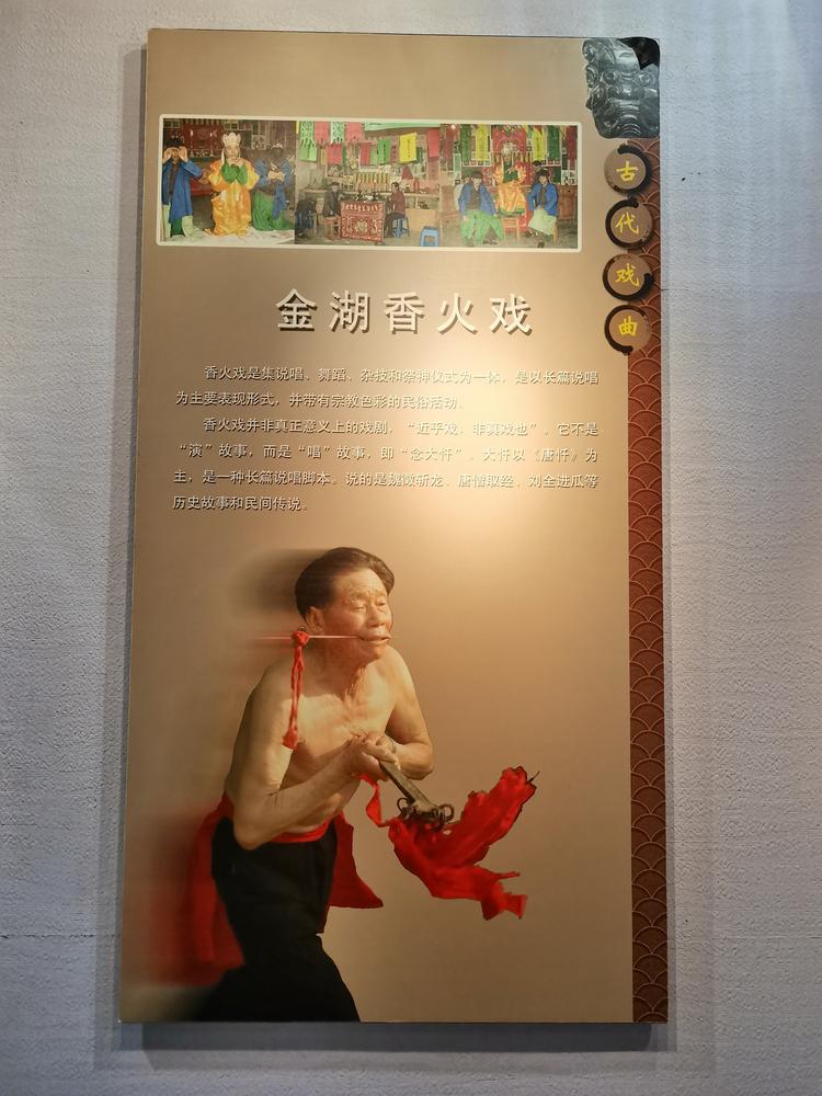 戏曲知识厅:艺海拾贝、梨园芬芳。戏曲知识厅是介绍全国、江苏省和淮安市的戏曲分布状况和淮安从外地引进的地方戏曲活动情况;以及戏曲方面的有关知识。淮安的主要地方剧种是淮剧和淮海戏,但在历史上也曾有过越剧、吕剧、泗州戏、木偶戏等专业剧团存在过,黄梅戏更已在盱眙县生存发展了五十多年了,现已成为江苏省唯一的一个黄梅戏剧团。这一部分展的还有戏曲知识中有关服装、脸谱等方面的一些内容,目的是让参观者有些直观的感觉。