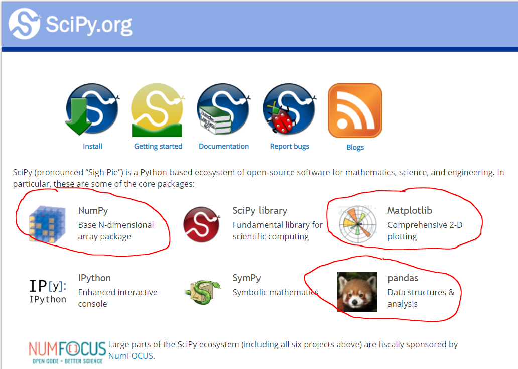 如果安装的是Anaconda发行版,那么它已经自带了以下库: Numpy、 Scipy 、Matplotlib, Pandas 和Scikt-Leam。