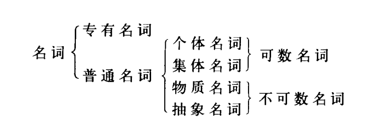 其中个体名词和集体名词可以用数来计算,称为可数名词(CountableNouns),而物质名词和抽象名词一般都不能用数来计算,称为不可数名词(Uncountable Nouns)。因此名词的类别可以下表表示: