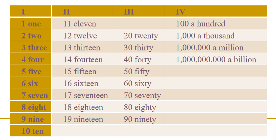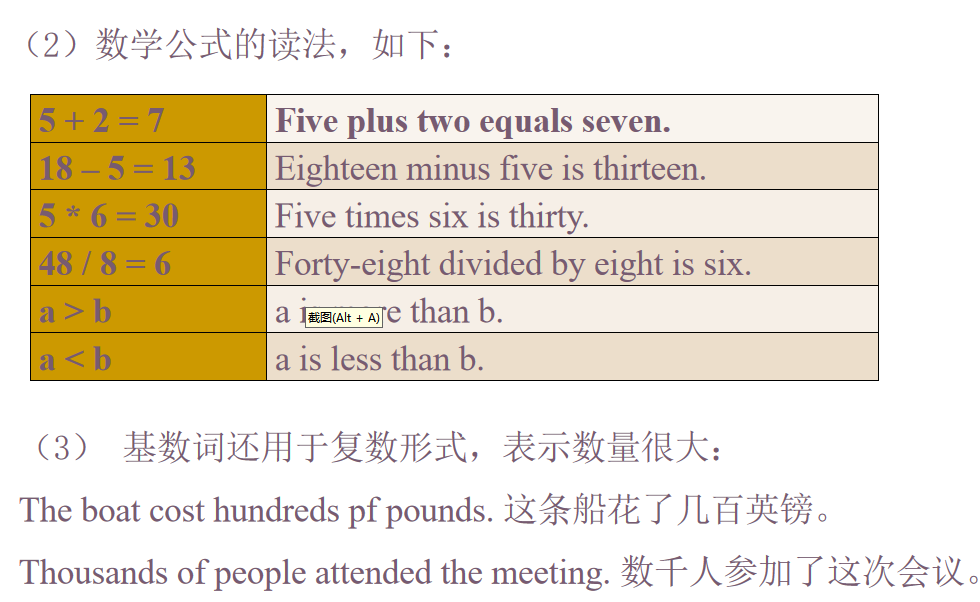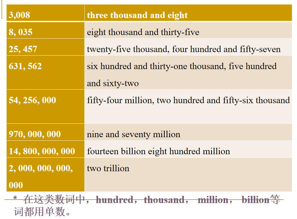③ 1,000+:先从后向前数,每三位数加一个逗号,用这个方法把数目分作若干段,再一段段的念;第一个逗号前的数为thousand,第二个逗号前的数为million,第三个逗号前的数为billion。这里应注意,和中国人的习惯不同,英语中是每三位数变一个新的等级,而中文中是每四位数更新一个等级。比如: