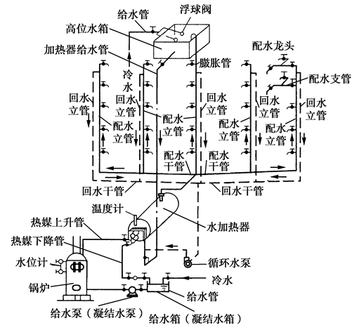下图全称:间接加热开式全循环全天供水下行上给式机械循环热水供应系统