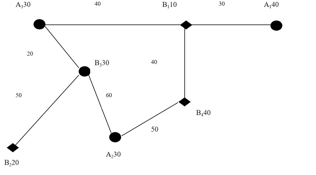 设有A1 、A2、A3这3个配送点分别有化肥40t、30t、30t,需送往4个客户点B1、B2、B3、B4,而且已知个配送点和客户点的地理位置及他们之间的道路通阻情况,可据此出相应的交通图。(图1)