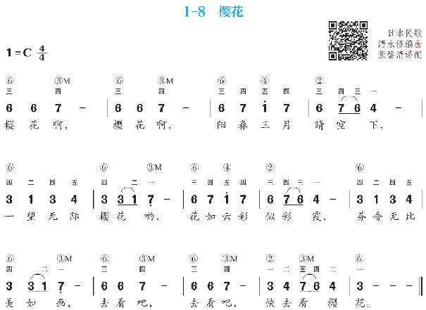 提示:《樱花》弹唱的时候一定要注意柔和、连贯、抒情,将日本人民对家乡盛开的樱花的赞美之情表达出来。