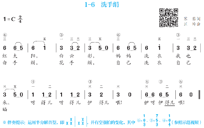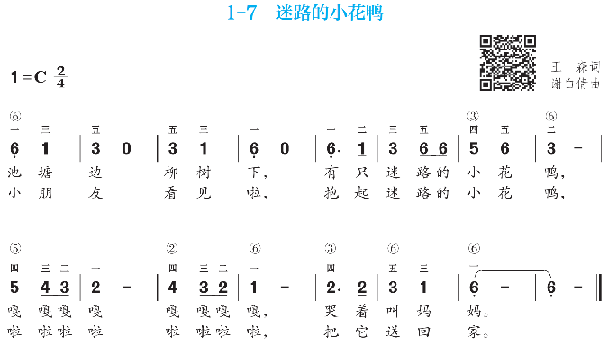 提示:《迷路的小花鸭》这首歌弹唱的时候要注意表现力要强,突出画面感,将迷路的小花鸭害怕的模样和小朋友将它送回家的情感对比表现出来。
