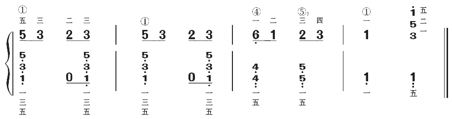 此外,还可以使用属七和弦,即C7和弦,由C、E、G、B组成。(注意这里的C、E、G、B,即固定调的1、3、5、7,首调要唱5、7、2、4)