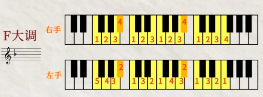 (三)F大调音阶左右手指法图示。