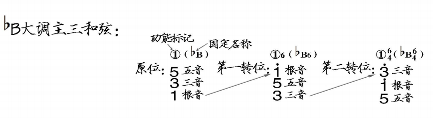 二、♭B大调主三和弦(一级三和弦)原位及转位的构成各音。