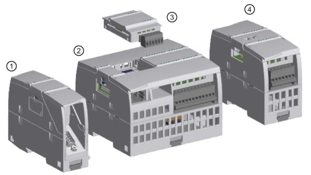 通信模块 (CM) 或通信处理器 (CP)② CPU模块③ 信号板 (SB)(可以是数字量 SB、模拟量 SB),通信板 (CB) 或 电池板 ④ 信号模块 (SM)(可以是数字量、SM模拟量、SM 热电偶 SM、RTD SM、工艺 SM)
