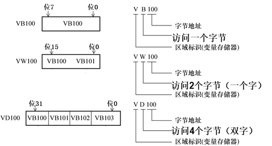 字节、字和双字寻址用于对存储器中的某些字节、字或者双字中所存数据的访问,一般整数,实数的数据类型会采用位地址方式寻址。其寻址规则为:“存储区的符号+访问长度+起始字节号”,其中访问的长度若是1个字节用Byte的第一个字母B表示,访问的长度是2个字节也就是一个字,用Word的第一个字母W表示,访问的长度是4个字节也就是双字,用DoubleWord的第一个字母D表示。