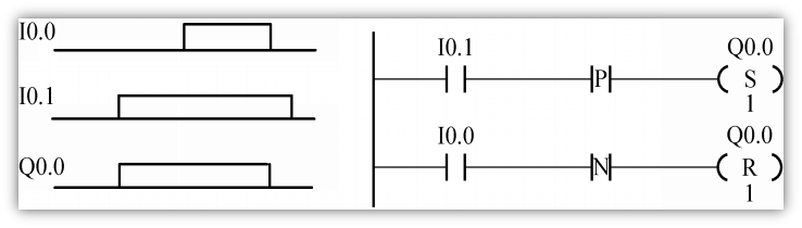 当刚按下按钮I0.1时,电机Q0.0启动,当按钮I0.0刚释放的时候电机Q0.0停止。