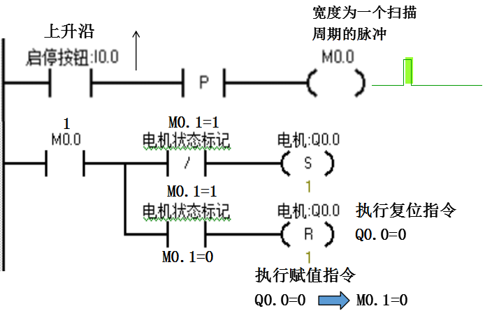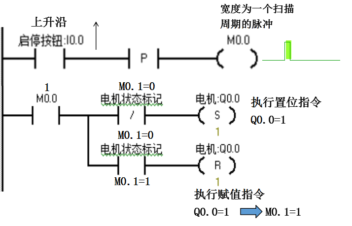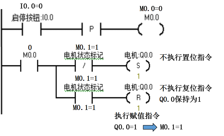 当第一次按下按钮I0.0时,如果原来电机为停止状态M0.1=0,这时候会执行置位Q0.0的指令,电机启动;