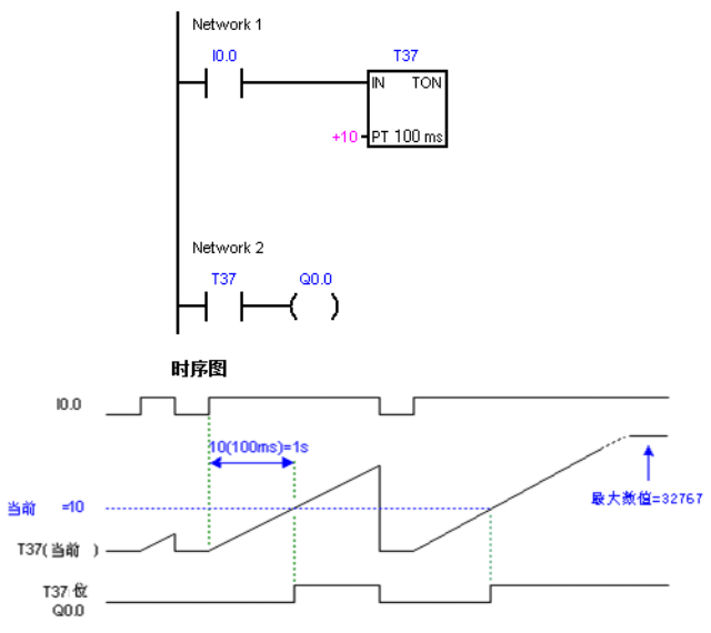 当使能(IN)输入端信号为 1 时,TON(On-Delay Timer,接通延时定时器)指令开始计时。如果定时器的当前值(Txxx)大于或者等于预设值(PT),TON 位输出 1。达到预设值后定时器继续计数,并在达到最大值 32767 停止计数。当使能输入为 0 时,定时器复位, TON 位输出 0。
