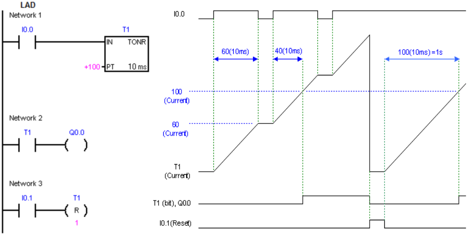 当使能输入为 0 时,TONR 定时器的当前值保持不变。因此 TONR 定时器可以累积计算多次使能输入为 1 的时间段。达到预设值时定时器继续计数,直至到达最大值 32767 时定时器才停止计数。