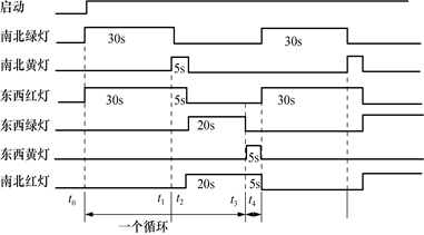 当启动开关接通后,信号灯系统开始工作,先南北绿灯亮,东西红灯亮;当启动开关断开时,信号灯系统关闭。启动开关接通后,南北绿灯亮30s,同时东西红灯亮30s后,东西红灯与南北黄灯一起闪烁5s。闪烁时间到后,东西红、南北黄灯灭,东西绿灯亮、南北红灯亮。东西绿灯亮20s,同时南北红灯亮20s后,南北红灯与东西黄灯一起以2HZ频率闪烁5s。闪烁时间到后,南北红、东西黄灯灭,回到初始:南北绿灯亮、东西红灯亮。并按上述规律,周而复始。