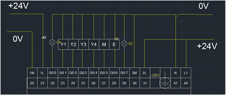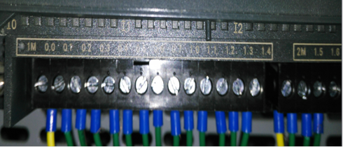 输出点的接线端子,标有各端子对应的地址,分别是:Q0.1~Q0.7,Q1.0~Q1.7,这里共有16个数字量输出点;
