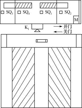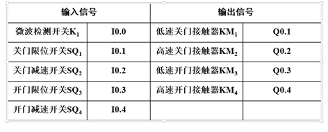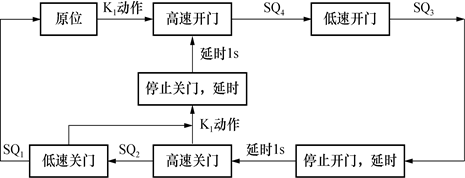 微波人体检测开关检测到有人,高速开门,高速开门减速开关动作,转为低速开门,开门到位,停止开门并延时;延时到,高速关门,高速关门减速开关动作,转为低速关门,关门到位,停止关门;在关门期间,微波人体检测开关检测到有人,停止关门,延时1s,自动转为高速开门。