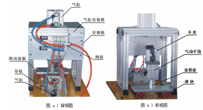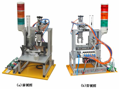 3、 装配单元是将该生产线中分散的两个物料进行装配的过程。即完成把本单元料仓中的小圆柱工件(黑白两种颜色)装入物料台上的半成品工件中心孔的过程。该单元的基本工作过程是:料仓中的物料在重力作用下自动下落,通过两直线气缸的共同作用,分别对底层相邻两物料夹紧与松开,完成对连续下落的物料的分配,被分配的物料按指定的路径落入位置转换装置,该装置摆动完成180度位置变换后,由前后移动气缸,上下移动气缸,气动手指所组成的机械手夹持并位移,再插入已定位的半成品工件中。