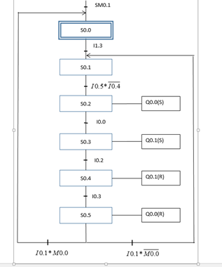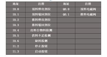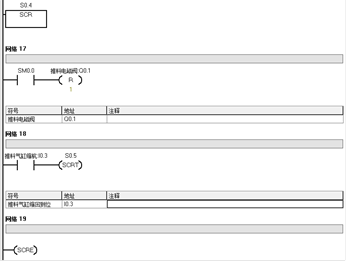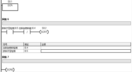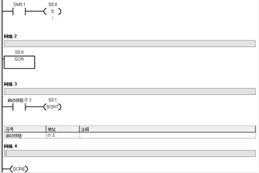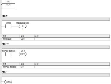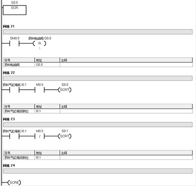 从工艺流程上,我们看出动作的顺序是:1、,系统启动前,顶料杆和推料杆都不动,处于缩回状态;2、顶料;3、继续顶紧物料,并推料;4、继续顶紧物料,推料杆缩回;5、顶料杆也缩回;然后回到初始步,顶料杆和推料杆都处于缩回状态,一共可以分为5步每一步的标记位,我们用存储器S0.1~S0.5表示。
