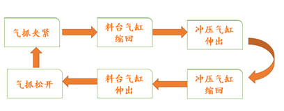 启动设备,物料放上加工台,气爪夹紧——加工台缩回——冲压气缸向下冲压——冲压气缸缩回——加工台伸出——气爪松开