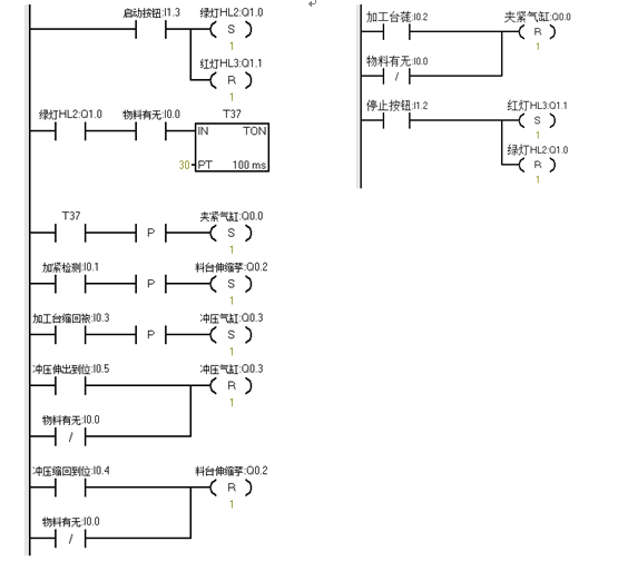 4、若有人按下停止按钮,加工单元在完成本周期的动作后停止工作。绿灯灭,红灯亮。
