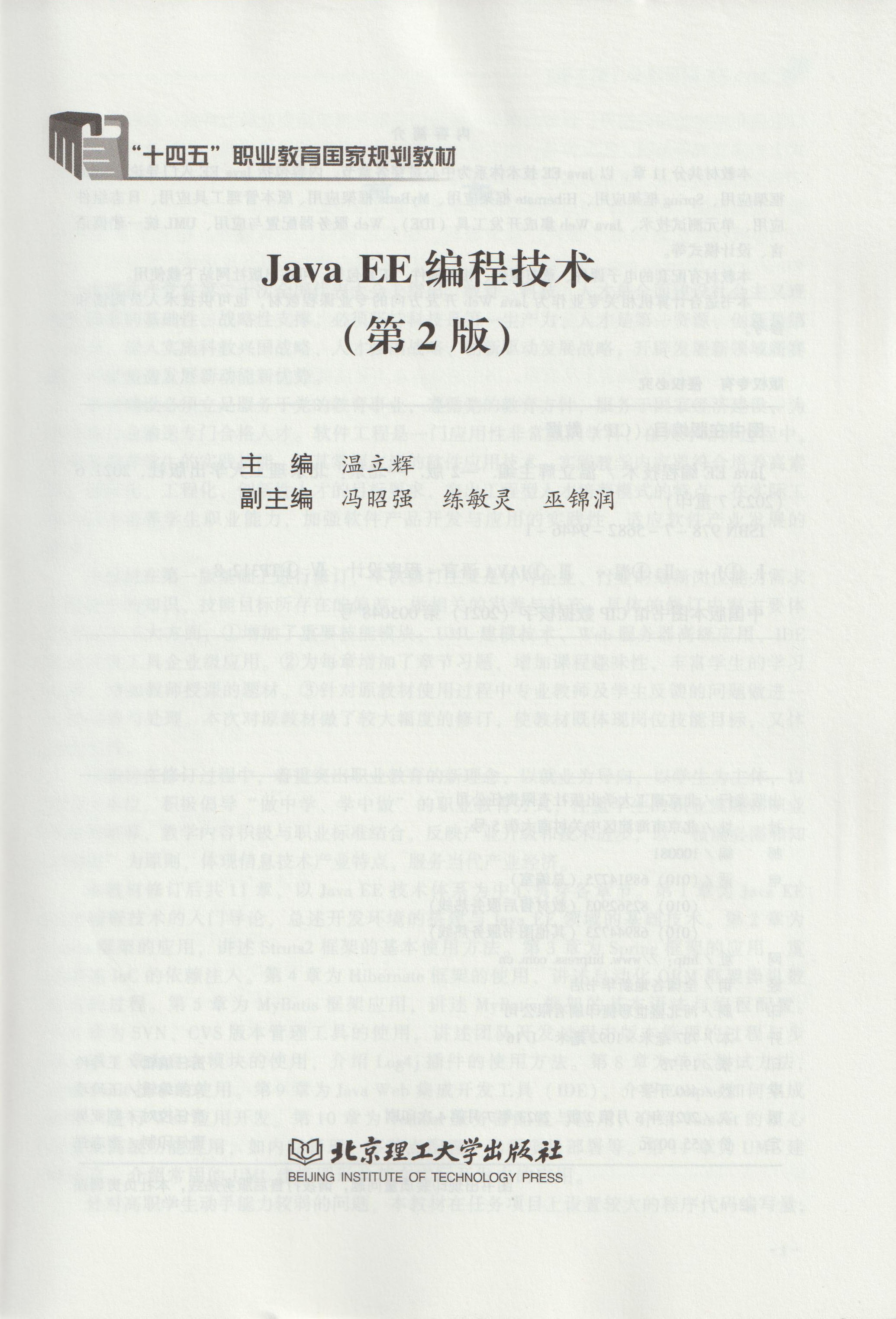 “十四五”职业教育国家规划教材:《Java EE编程技术(第2版)》 主编:温立辉 ; 副主编 : 冯昭强、练敏灵、巫锦润 北京理工大学出版社 2021年06月