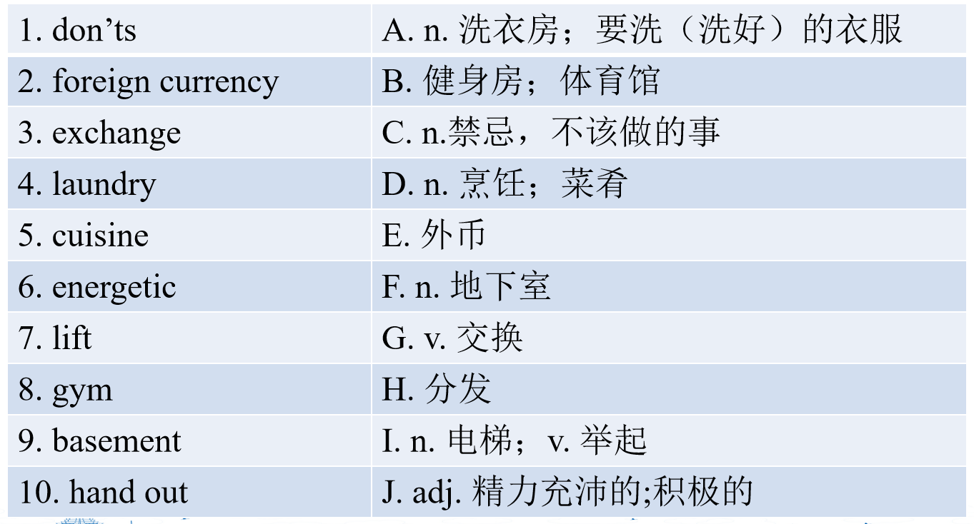【重点词汇和短语】Please learn the key vocabulary and phrases and try to match the English and Chinese terms. 请自学重点词汇和短语并尝试将中英文进行搭配。