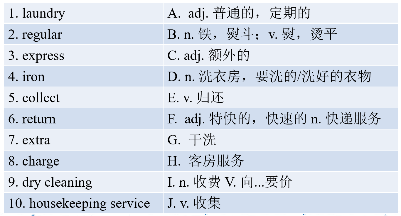【Discussion讨论】: Have you ever used the laundry service in the hotel?Do you know what types of laundry service are available? 你使用过酒店的洗衣服务吗?你都知道哪些类型的洗衣服务呢?