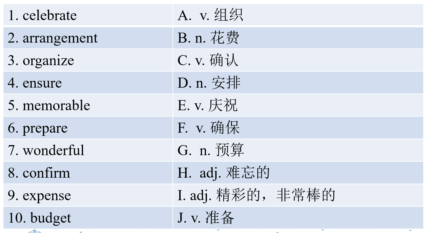 【重点词汇和短语】Please learn the key vocabulary and phrases and try to match the English and Chinese terms. 请自学重点词汇和短语并尝试将中英文进行搭配。