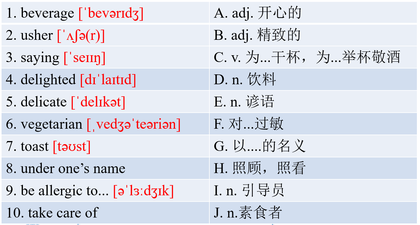 【重点词汇和短语】Please learn the key vocabulary and phrases and try to match the English and Chinese terms. 请自学重点词汇和短语并尝试将中英文进行搭配。